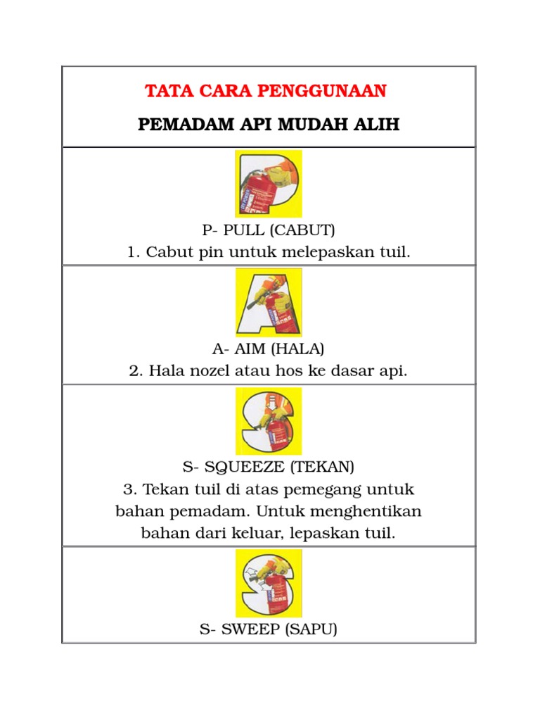 Cara menggunakan tabung pemadam api apar yang benar dan aman. Alat pemadam api halon dan penggunaannya adalah bahan pemadam kebakaran yang berfase gas, bersifat elektrik dan mudah menguap dan tidak akan menjadi residu. Cara penggunaan apar sangatlah mudah digunakan dan penting diketahui oleh setiap orang, agar pada saat terjadi kebakaran dapat segera memadamkan api dengan tabung apar yang sudah tersedia. Pemadam api tidak dirancang untuk digunakan pada kebakaran yang sudah tidak terkontrol. Berikut langkah demi langkah cara penggunaan alat pemadam api ringan apar. Menggunakan alat pemadam api mudah dan siapa saja boleh melakukannya. Gunakan cara menyapu ketika penyemburan alat pemadam api alat pemadam api ringan apar, tabung pemadam, alat pemadam kebakaran cara penggunaan tabung co2 pertama kali angkat dari tempatnya dandibawa ketempat terjadinya kebakarankemudian lepaskan pengaman, corong. Namun cara penggunaan apar tetap harus sesuai sop penggunaan. Tanggal, acu, tekan dan sembur atau pull, aim, squeeze and sweep (pass). Petunjuk penggunaan tabung pemadam api. Dengan mengetahui bagaimana cara penggunaan alat pemadam api dan bagaimana api terbentuk, kini anda dapat melakukan proteksi dini jika. Cara ini merupakan metode standar yang dipakai dinas pemadam kebakaran maupun user / pengguna dengan penjelasan sebagai berikut Cari tahu cara penggunaan alat pemadam api yang baik dan benar sebelum kamu mencoba menggunakannya.